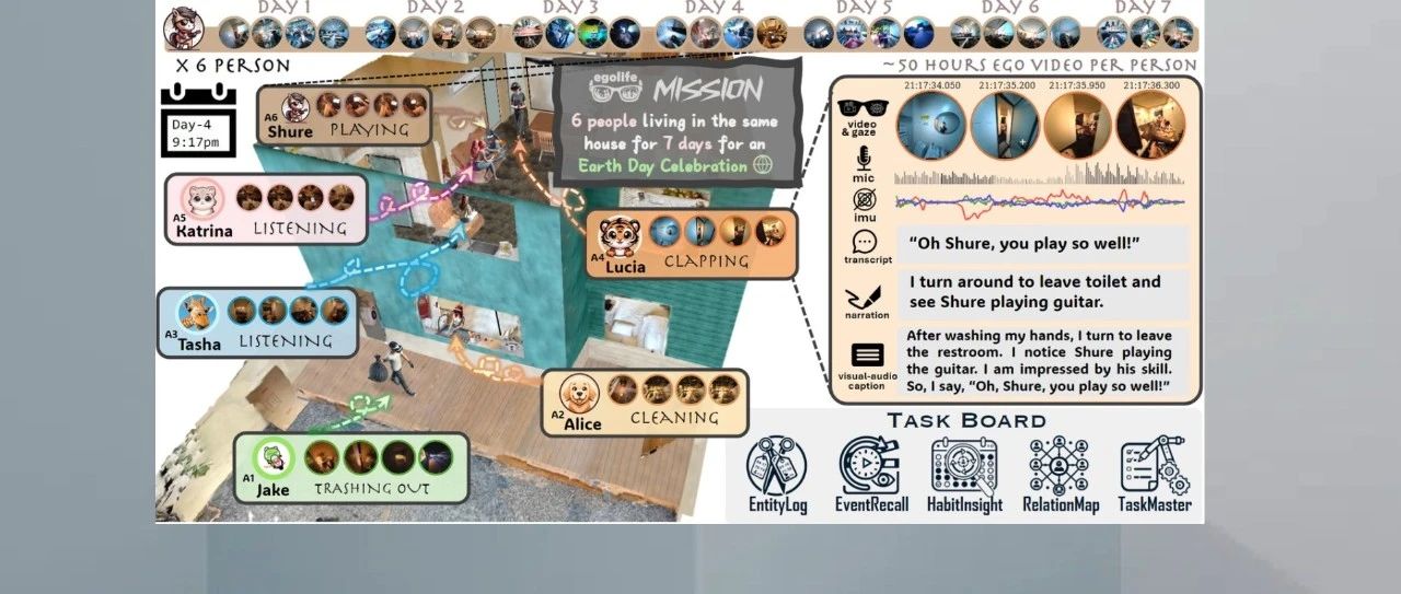 现有数据集的局限性:现有数据集(如Epic-Kitchen和Ego4D)记录时间短,视角单一,无法捕捉长期行为模式和社会互动的复杂性。 个性化AI助手的挑战:需要开发能够理解超长期行为模式、多模态数据(视觉、音频等)以及多视角互动的AI系统,以提供个性化的生活辅助。 长上下文问答的难题:如何从长时间跨度的多模态数据中提取信息,回答与日常生活相关的复杂问题(如物品定位、健康习惯跟踪等)。