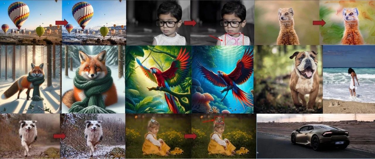 指令修正(Rectified Instructions): 利用VLM(如GPT-4o)分析原始-编辑图像对的差异,生成更匹配的编辑指令。 基于扩散模型推理阶段的生成属性(如不同步骤对应不同图像属性),制定统一的指令修正准则。 对比监督信号(Contrastive Supervision):构建正负样本指令(正确指令 vs. 错误指令),通过三元组损失(triplet loss)优化模型,增强对复杂场景的理解。