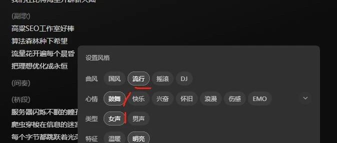 高粱seo觉得这份歌词真的很棒,几乎融入了高粱seo工作室的业务范围,比如代码编辑就是程序,算法森林就是seo优化,关键词,流量,服务器,爬虫等等字眼,都是与高粱seo工作室业务息息相关的。最终的ai音乐名称叫做《流量狂想曲》,高粱seo没想到,连歌名都起得这么好,真够棒得,下面一起来听听效果吧: