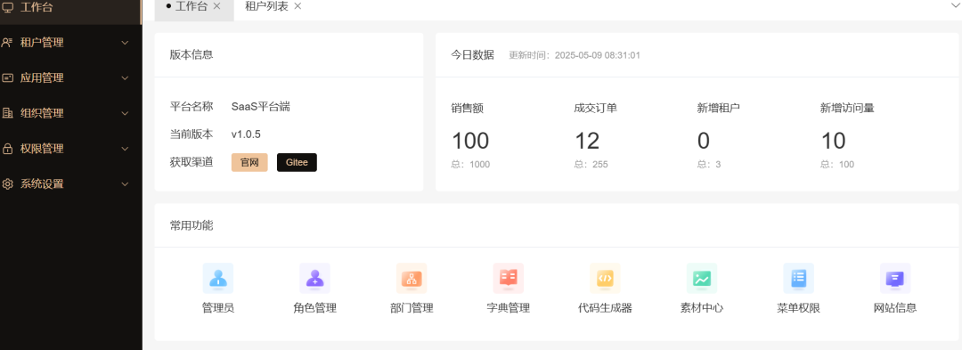 :提供完整的后台管理界面,支持复杂业务操作。 - SaaS 多租户模式