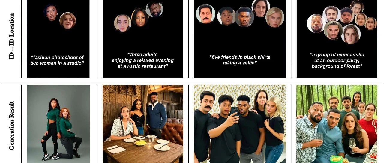 目前对于个性化多人图像生成仍然面临很大的技术挑战。比如最大的难点就是身份特征泄露,明明是两个人,结果生成的面容却"融合"在一起,让人傻傻分不清。而且,用户还希望能精准指定每个人的位置和动作,让构图更自然、互动更有趣。一旦位置出错,可能生成的图像就惨不忍睹了!