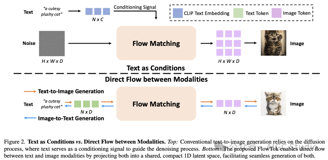 跨模态生成的核心在于连接不同的模态。传统方法将文本模态视为一种调节信号,逐步引导去噪过程从高斯噪声过渡到目标图像模态,而我们探索了一种更简单的范式——通过流匹配直接在文本和图像模态之间演化。这需要将两种模态投影到共享的潜在空间中,但由于它们本质上不同的表示形式,这带来了巨大的挑战:文本高度语义化,编码为一维标记,而图像在空间上具有冗余性,表示为二维潜在嵌入。
