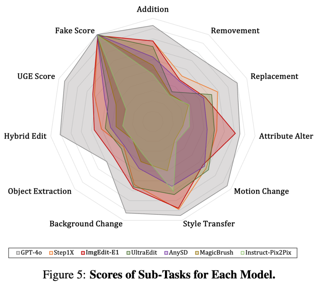 首先对不同方法进行了全面的定性评估(结果如下图5所示)。开源模型与闭源模型之间存在显著性能差距:GPT-4o-image在所有维度上均优于开源模型,仅在部分高难度任务中稍显不足。该模型同时获得最高的UGE综合评分,展现出更强的理解能力、定位能力和编辑能力。