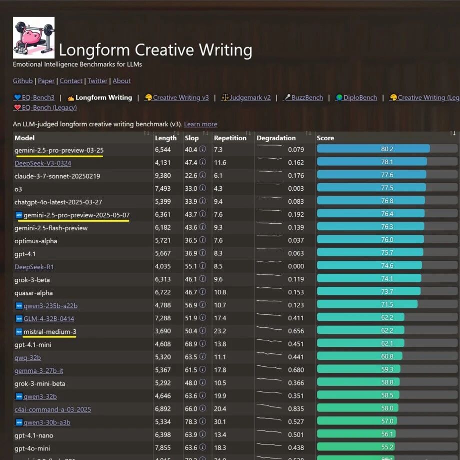 评分和Gemini 2.5 Pro、Claude 3.5 Sonnet差不多