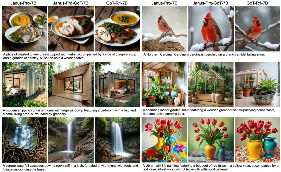 这些提升主要归因于基于 MLLM 的奖励设计,它指导模型在 GoT 推理过程与输出图像之间优化语义和空间对齐。通过利用 MLLM 的细粒度评估,奖励机制使 GoT-R1-7B 不仅在视觉质量上表现出色,还能忠实捕捉复杂提示的意图。