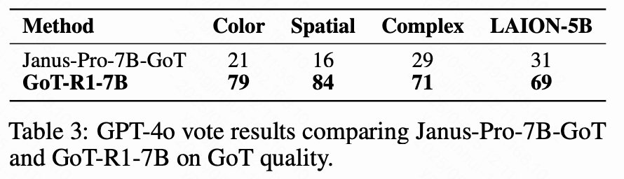 评判基于四个标准:与输入提示的相关性、对象描述和边界框的准确性、文本的清晰度和流畅性。 如下表 3 所示,GPT-4o 在所有评估类别中都更倾向于 GoT-R1-7B 的自探索推理。这一强烈偏好强调了 GoT-R1 在自主发现和生成更优推理路径方面的能力,这是其提升组合生成能力的关键因素。