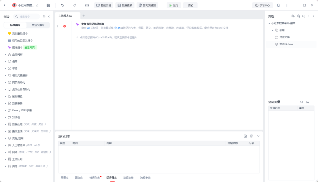 而且,这个东西,是保存了以后,可以十年稳定如一日的运行的(前提是小红书不改界面),做一次,以后可以一直用。 而且不只是10个,我们完全可以让他存50个笔记,100个笔记,200个笔记。每天抓取一次,这个对于自己学习作用有多大,不言而喻。 生成完的流程,大家一定要记得,点击确定,因为他只是流程,还不算应用。 记得先拖一个网页自动化里的打开网页,到主流程中,以后一运行,就会自动打开小红书了。 刚才保存下来的内容,我们如果想自动再让RPA帮我们做一轮数据筛选。就可以继续点击魔法指令,但是这一会,用数据处理,帮我们搞excel。 我们再运行测试一下。结果出现了BUG,但是不用慌,直接点击智能修复就行。 最后,你甚至可以,把这些处理完的数据,直接自动化的,上传到飞书多维表格里。 以后,每天,你只要需要打开影刀,运行一下,你就有了,全新的AI领域的小红书爆款内容。 你甚至还可以进一步当个懒癌,跟触发器打通,每天定时自动运行。。。 我们还手搓了几个其他的流程,比如每次新生图模型出来,我用我的excel测试集去测,都巨麻烦,因为新模型几乎不可能开放API。 那现在,直接可以用嘴搓个自动生图流程,比如我就搓了个即梦的。 写到这里,我真的是发自内心想说一句: