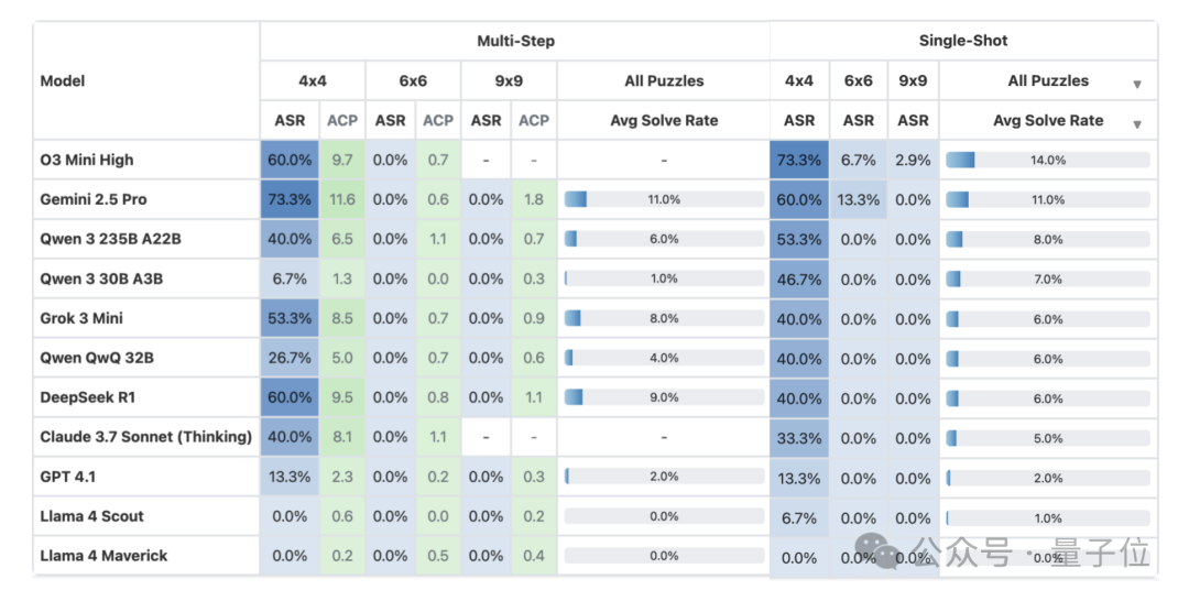榜单显示,大模型不仅总体正确率只有15%,在9×9的现代数独中,即使是高性能模型o3 Mini High,正确率也只有2.9%。