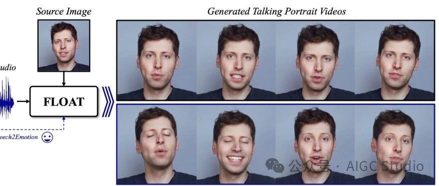 今天给大家介绍的 FLOAT 是一种基于流匹配的音频驱动的说话肖像视频生成方法,可以增强语音驱动的情感运动。