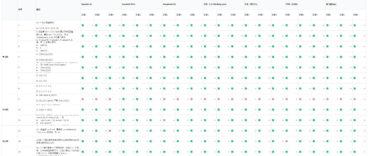 我本来真的没打算卷这个选题,因为知道大家肯定都会写,都会卷,我也想休息休息,真的就不打算写了。但是吧,用AI测语文考试还没啥,但是看了一些用AI做数学考试的文章,真的给我看的一脸地铁老头表情包,就,那个测试方法,也特么太扯淡了。结果最后得出一些不太靠谱的结论,我觉得还是蛮误导大家的。所以我觉得,我想按照我的玩法,再严谨一点的测一下大模纯数学能力型高考,给大家看一下,真实客观的评分。1. 不考解答题(因为给我标准答案我也看不懂,不知道咋给分。。)2. 所有的题目截图全部使用LaTeX编辑器转成LaTeX文本格式,再扔给大模型进行回答。LaTeX是学术界最广泛使用的数学公式排版语言,能最精确地表达数学符号,我们考的是模型的数学能力,不是考模型的多模态识图能力,比如DeepSeek根本就没多模态,用的是OCR提取文本,很可能识别错误,所以截图上传不公平,一律转化成LaTeX格式再进行统一测试。3. 剔除掉单选题第6题,因为这是单选、多选、填空题中唯一有图表的,转成文字可能会有理解歧义,同时就一题,影响不大,直接剔除。4. 单题计分方法也依照高考判分原则:单选题7道,每道5分,选项正确计分,错误不得分;多选题3道,每道6分,全对计6分,漏选按正确答案数量计分,如答案为ABCD,漏选其一扣1.5分,错选不得分;填空题3道,每道5分,填空正确计分,错误不得分。5. 每道题都会使用大模型跑3遍,根据正确比例进行分配,最大程度减少幻觉。比如OpenAI o3模型,做单选题第7题,对2次,错1次,则实际得分为5*0.66=3.3分。6. 只开推理、不使用Prompt引导、不开联网、不允许写代码在沙盒进行计算,比如o3,我直接把这几个功能关掉了。测试模型为OpenAI o3、Gemini 2.5 pro、DeepSeek R1、豆包(1.5-thinking-pro)、元宝(混元T1)、千问3(235B)、讯飞星火X1,均为推理模型。在晚上凌晨2点开始测试,因为搞API写脚本反而可能更麻烦,所以直接搞了个表格,复制粘贴测了,以至于喊了我的几个好朋友@卡尔的AI沃兹、@Max、@猫先生 一起测,硬生生测到凌晨4点。7道单选题、3道多选题、3道填空题,总分一共68分。我们得出了,我认为,非常公平客观的,每个模型的考试结果。没有收任何家钱,也没有任何利益关系,全部客观公正。第9题是个非常神奇的题目,是个多选题,只有Gemini 2.5 Pro每次都对了,其他的所有大模型,几乎全都有问题,D选项倒是全都答出来了,但是缺了B。而那个DeepSeek第11道题错的那道题,其实并不是真做错了,明明做对了,但是非要作死的瞎答,比如11题多选题,DeepSeek R1错了一道题。Gemini确实非常强,在整个逻辑上,没有一题是错的。而豆包、混元、星火位列第二梯队,在第9题上漏了一个选项,并列屈居第二。DeepSeek半对半错了一个多选题,丢了0.7分,排名第五。而Qwen3和OpenAI o3因为两个都错了1次填空题,只能被迫垫底。。通过我的测试,我相信,大家应该对于模型的数学能力,有一些了解了。高考对于现在绝大多数的推理大模型来说,其实真的就是,没有特别大的难度,跟2023年的时候,真的是天壤之别。很多测出来测的非常离谱的文章,其实最后答案错了,跟推理模型本身没有半毛钱关系,而是你把截图扔过去,各种符号啥的识别错误。比如则 \complement_{U} A,硬生生识别成了CuA。所以,折腾到现在,这场公平、客观的AI数学高考终于落幕了。其实吧,我们不睡觉,熬夜折腾这么久,想得出的并不仅仅是一个简单的分数。而是我们我们想知道,怎么才算是一场合格的AI考试。规则公正,流程严谨,技术中立,少一点博眼球的夸张,多一点对真相的执着。我始终相信,无论是对技术,还是对人生,严谨总能让我们更接近真实。以上,既然看到这里了,如果觉得不错,随手点个赞、在看、转发三连吧,如果想第一时间收到推送,也可以给我个星标⭐~谢谢你看我的文章,我们,下次再见。
