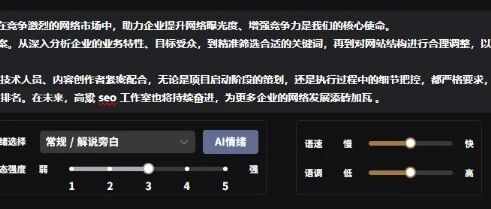这就是ai克隆声音后阅读文案的效果,高粱seo觉得效果真的很好,跟原声音质都接近程度非常高,而且在转换时,可以允许选择声音语气,同时还有其他参数可以根据自己的情况来进行调整。