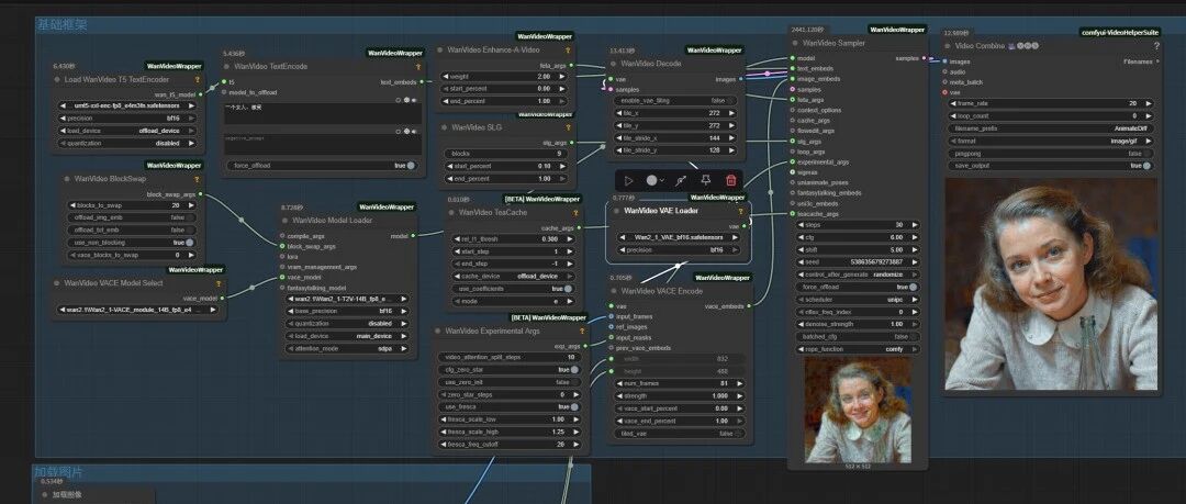 相信很多人都刷到这种让老照片动起来的视频,看着那些充满年代感的照片突然以一种活灵活现的感觉出现在自己眼前,特别是看着多年前的亲人、故友突然从照片中"活过来"时,心情还是挺激动的。今天我们就用comfyUI来实现让老照片动起来的效果。要实现让老照片中的人物动起来,我们要分为两个步骤来实现。这个步骤的功能就是要让一张发黄的老照片变成一张高清的写实照片。这个功能在上篇文章中讲过,借助 flux.1 Kontext 强大的功能,只要用一个工作流、三个节点就能轻松实现让老照片修复的功能,而且还能免费白嫖。得到清晰的写实照片后,我们再用图生视频功能就可以让照片动起来。方法有也有很多,用framepack、Wan2.1都可以轻松实现。那么问题来了,能不能只通过一个工作流就一次性实现这个功能呢?其实也没什么难的,就是将老照片修复和图生视频两个工作流连接到了一起,将kontext的输出管道连接到图生视频的图片加载节点就可以了。但是啊,但是,当我将两个工作流串起来跑的时候,悲剧也随之发生了:系统报错,提示显存不足!所以,我们还是老老实实分成两个步骤,用两个工作流来跑吧。我用wan2.1VACE工作流和framepack F1工作流分别跑了一遍图生视频。下面这个是wan2.1VACE工作流的截图,整个工作流像密密麻麻的电路板,用它跑出来的视频人物更自然,更真实,但耗费资源和时间更多。下面这个是framepack的工作流截图,看起来就比VACE的工作流简单多了,facemack耗费资源比较少,耗时也比较短。左面的是VACE跑出来的视频,人物的皮肤、光线等更加自然和真实,但耗费资源也比较多,耗时更长。为了平衡时间,VACE用的分辨率要低一些,所以图片看起来没有右面的framepack跑的视频清晰。最后,将本次用到的工作流放在最后面,都可以免费在线使用的。https://www.runninghub.cn/post/1932800388817195010