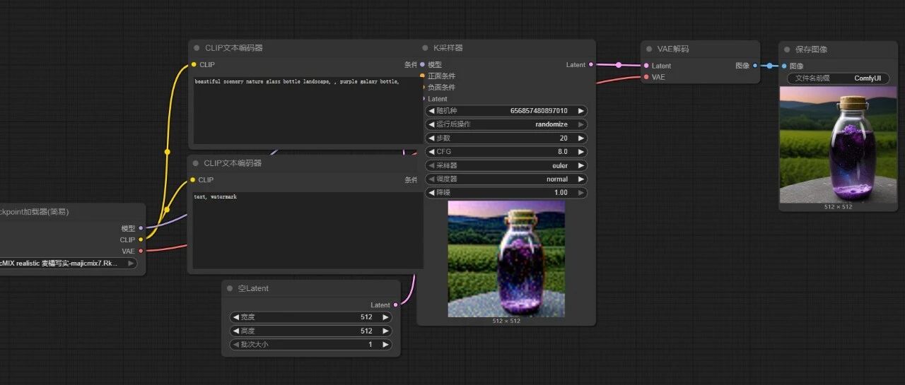 打开后的界面是一个 comfyUI基本的文生图工作流,因为我们没有下载模型,所以运行后报错。