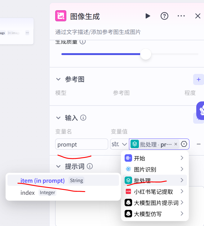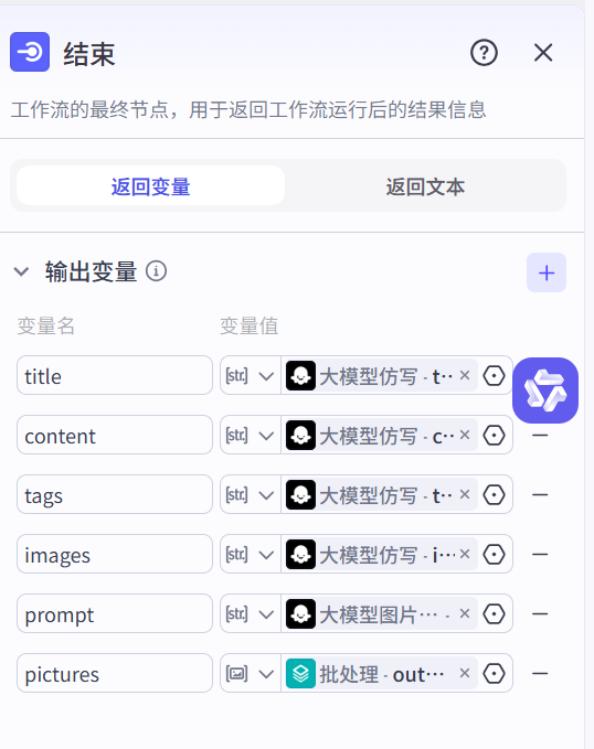 根据url会自动提取小红书笔记的【内容,标题,图片集url】基于上边爬取到的图片,对图片进行描述识别,方便后边生成相似图片这里用到了input中的APIkey,这个APikey需要注册智谱去免费获取复制 API key ,填写在 input对应位置使用【智谱AI识别图片】节点时注意,因为小红书上的图片一般都是多张,所以这里使用批处理,循环处理每一张图片生成描述使用大模型,对【标题,内容、文本化的图片】进行重构,输入部分注意,图片输入的是识别后的描述,不是原图片系统提示词我在网上找了一个别人的,哈哈,太长了文末获取吧仿写完,大模型会输出,四部分,都是json数组形式,后边会用到,基于图片描述,生成提示词,这里使用的还是大模型节点,配置如下接下来开始进行文生图,就是将提示词转成图片,这里使用批处理节点,循环进行文生图批处理的输入是图片的提示词数组,输出data图像,如下:这个地方你可以只输出自己需要的数据,比如【标题、内容、图片】,然后将结果发布到小红书即可大家可以按照我这教程实现以下,不想自己搞得可以加我微信付费进入我的扣子私有空间去复制,名额有限,创作不易,请理解