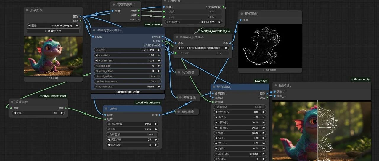 lama节点左侧的图像管道和加载图像连接,遮罩管道从刚刚的RMBG抠像节点的mask管道连接