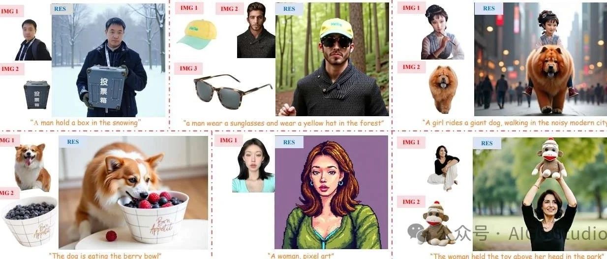 可以使用多种条件(ID、IP、试穿)来生成更具创意的图像。得益于论文中提出的特征路由约束,DreamO 有效地缓解了多个实体之间的冲突和纠缠。