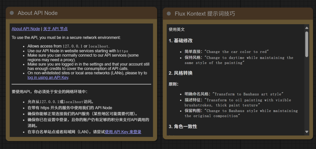 max版和pro版可以通过 API付费来调用,价格方面max每张图片不到6毛钱,pro每张图片不到3毛钱。Flux.1 Kontext的具体使用方法可以看下我昨天的文章:在将ComfyUI升级到最新版本后,打开模板,就能看到官方已经自带了Flux.1 Kontext的工作流了。在模板中找到"图像API",排在最前面的两个分别是pro版和max版的工作流。pro版和max版的工作流是一样的,都是由一个加载图像节点、Kontext节点和一个保存图像节点构成。它操作起来也非常简单,只要输入一张图片,然后再输入提示词就可以了。官方还贴心地给出了中文版的提示词技巧,我们可以从中学习它的各种提示词书写格式。不过要注意的是,Kontext不支持中文提示词,如果想用中文提示词,需要再外接一个翻译节点。本着一切白嫖的理念,下面我们打开runninghub上面的免费工作流进行操作。免费工作流地址放在文末。