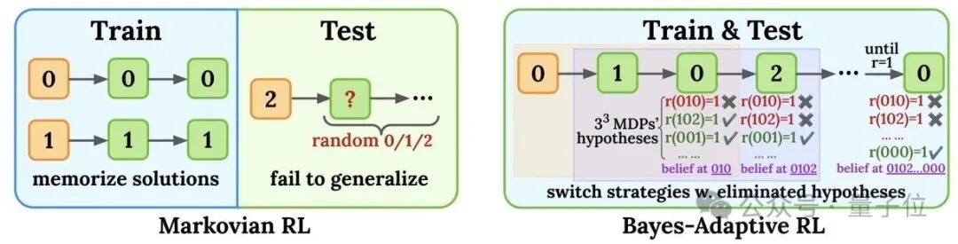 可以看到,左图中马尔可夫RL模型训练时成绩很快逼近100%但测试时几乎完全失败,中图的BARL模型则不仅训练表现提升,在测试时也取得了显著的高准确率。