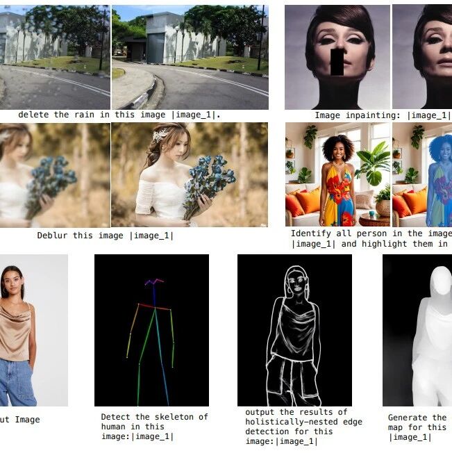 OmniGen 模型训练数据示例。将所有任务的输入标准化为任意交错的图像文本序列格式,用作模型的提示。占位符 |image_i| 表示提示中第 i 个图像的位置。