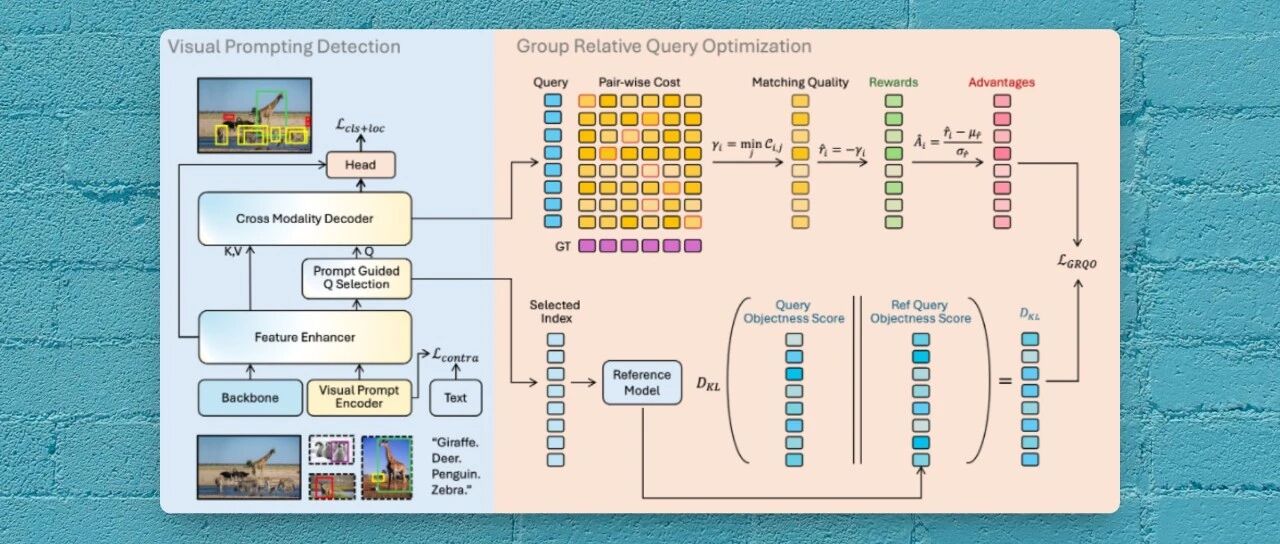 而真正的"灵魂"在于论文提出的GRQO (Group Relative Query Optimization) 训练策略。这是一种新颖的、针对视觉领域的强化学习式训练范式,包含两大核心组件: