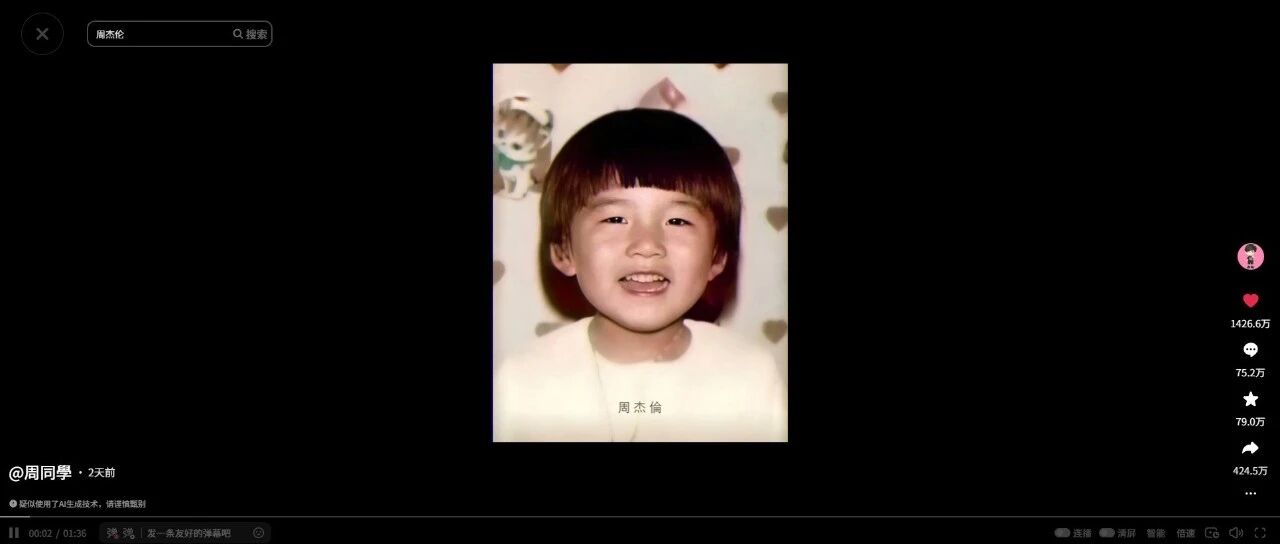 整个视频时长一分半,通过AI将周杰伦人生重要的节点和专辑丝滑地串联在一起。虽是AI生成,但视频竟意外地产生了一种史诗般的叙事效果。