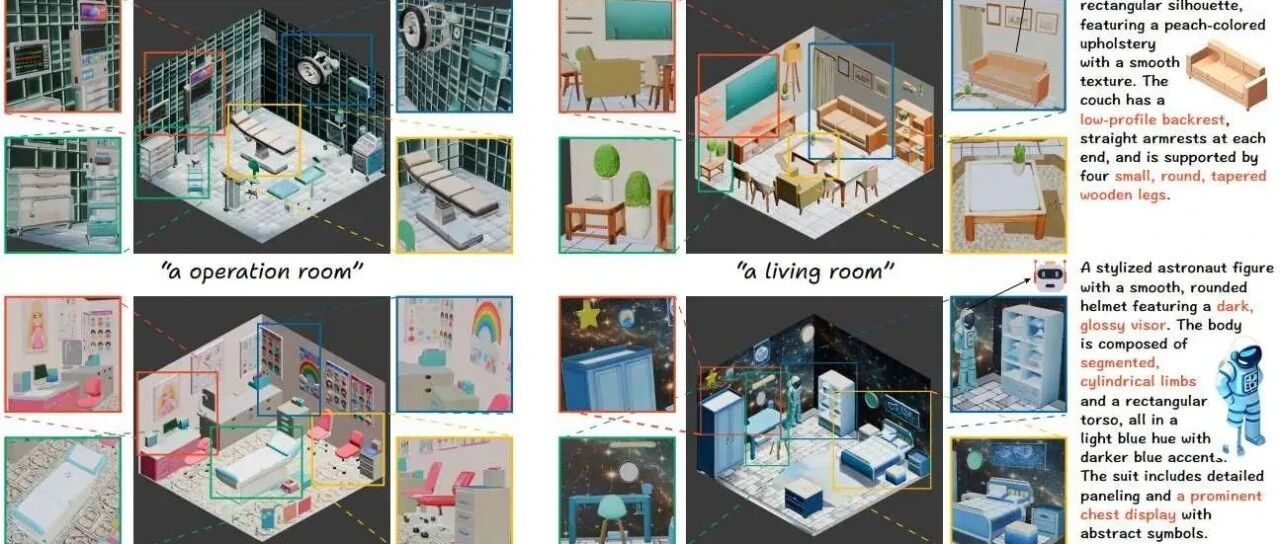 由英伟达和康奈尔大学提出的 ArtiScene 是一种无需训练、语言驱动的 3D 场景生成流程,它可以根据文本提示,设计出丰富多样、美观且易于编辑的场景,涵盖各种类别和风格。下图中展示了四种结果,并附有从不同角度放大的细节。所有元素均已生成,包括家具、装饰物、场景布局、地板和墙壁。首先利用文本转图像模型生成一个 2D 图像中介,然后从中提取丰富的布局和样式信息。例如,最右边一列显示了通过对象分割和 LLM 驱动的描述从图像中获取的对象外观和几何形状。