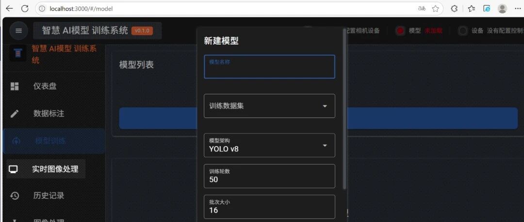 :选择预置算法模板(如缺陷检测、字符识别),配置训练参数后启动训练。 - 设备配置
