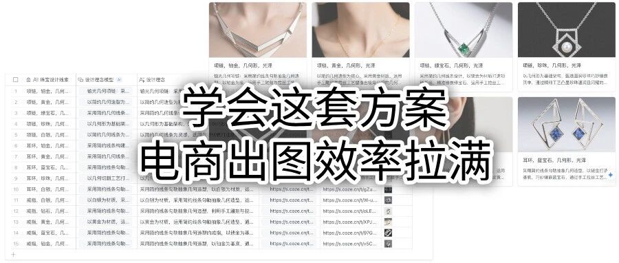 接下来舰长用珠宝电商批量出效果图的案例来拆解整个业务流程和技术搭建,最终我们可以用飞书多维表格中的画册向我们展现出来,那我们就需要准备好设计图和设计理念。