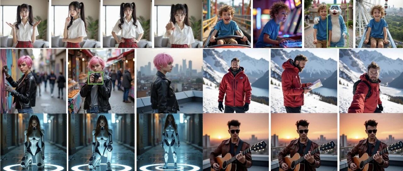 点追踪注意力机制(Point-Tracking Attention):自动感知并跟踪图像中的关键点,以保持前景角色的身份和细节一致性。 自适应 Token 合并(Adaptive Token Merge):优化视觉信息的表达与处理,提升整体一致性效果。 前景与背景的解耦控制:分别建模和控制前景角色与背景环境,实现更精细的生成控制。 基于 DiT 的一致性生成:首次将一致性生成方法与 DiT 模型结合,利用其强大的建模能力,无需额外训练或附加模块。