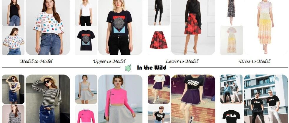 多人互动团体试穿(图7)。此功能源自SGM的创新设计,可无缝适配多位用户。给定多件服装,我们沿空间维度连接它们,同时生成多个伪人图像。图7。多人虚拟试穿。上行显示"模特到模特",下行显示"商店到街道"。