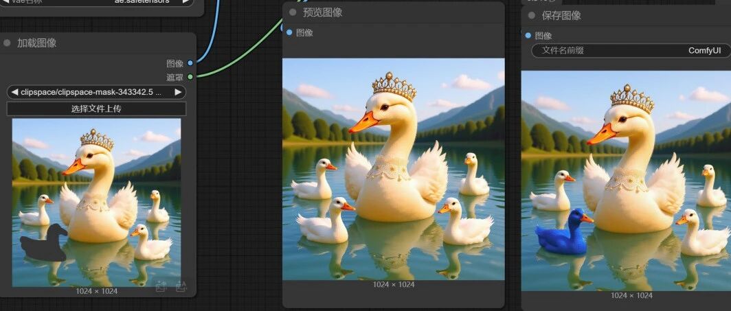 Kontext可以通过一句话实现对图片的编辑,让AI绘图的可玩性大大提高,但如果我们想对图片中的局部进行精确控制时,Kontext有时就会显得有些力不从心了。打开官方提供的 kontext 工作流模板,导入一张戴着皇冠的白鹅照片,输入提示词"将背景改为湖泊",背景很容易就更改为了湖泊。对于更改背景这类操作,Kontext确实又快又准确。但如果我想对一些复杂的画面进行局部编辑,比如下面这张图片,我想让画面中右边前面的这只鹅变成蓝色的,这时一方面语言描述可能不准确,另一方面即使我们描述准确了,Kontext可能也会理解错误。不信,我们用提示词"让右边前面的这只鹅变成蓝色的"试一下。很明显,Kontext 没能很好理解我的意思,Kontext将画面中所有的鹅都变成蓝色的 了。所以,想要对画面的局部进行精准编辑,就得用上局部重绘。在Kontext中,如果通过直接对原图进行局部重绘,再给指令的操作是无法实现我们的目的的。