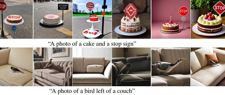 GenEval 提示的定性结果。ComfyGen 在多主题提示、着色和属性绑定方面表现更佳,但定位方面可能存在困难。