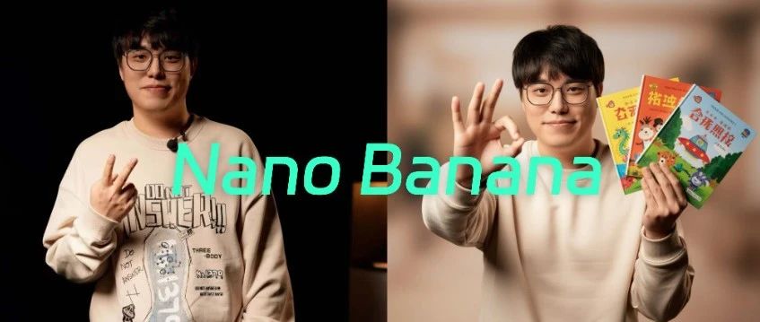你们可以看到,Nano Banana几乎完全保留了我的面部特征和表情,连嘴角弧度都是一致的,只是变了动作和手势。