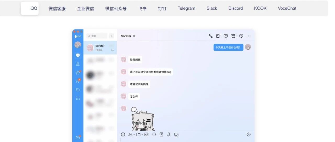 多平台,一次接入:官方已适配 QQ(OneBot 与官方机器人双协议)、微信(Gewechat)、QQ 频道、飞书、Telegram、钉钉、企业微信、Discord、KOOK、VoceChat,且仍在快速迭代。每个平台的消息事件被统一抽象成"事件总线",开发者只需写一次业务逻辑就能在所有平台生效,再也不用到处复制粘贴 if/else。