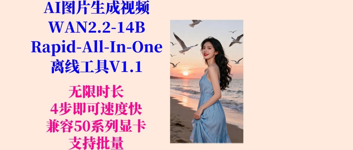 1、基于WAN2.2-14B-Rapid-AllInOne项目的V10模型,支持图生视频,支持批量,速度很快。