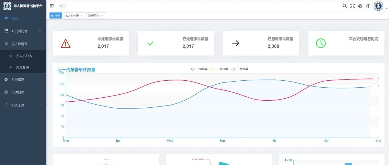 :动态展示预警数据(如近一周一/二/三级预警数量、已处理/未处理事件数)。 - 无人机状态监控与权限管理