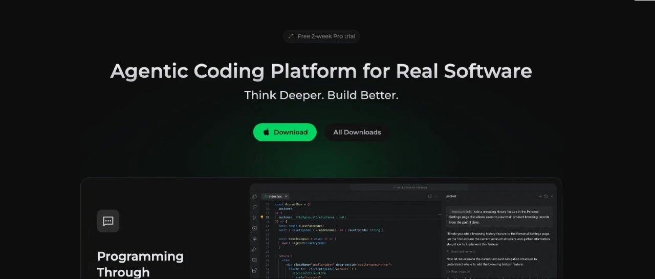 Qoder 不用邀请码,直接下载就能用,下载地址是 https://qoder.com/,目前支持 MacOS 和 Windows 系统。