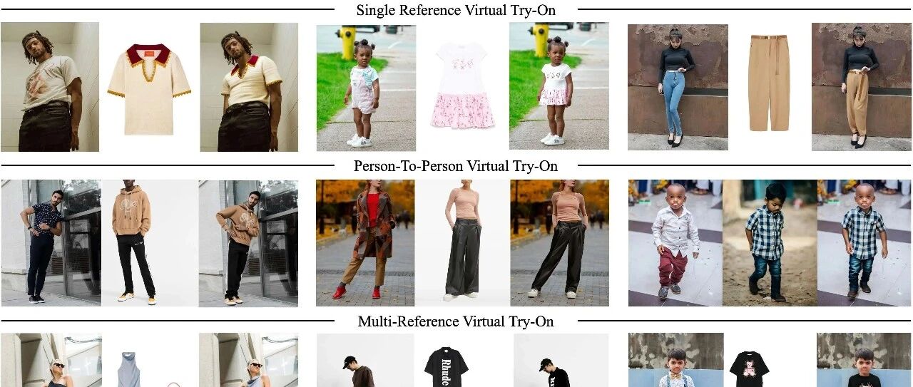 以往的虚拟试衣模型,大多局限于服装单品替换。而FastFit 能够同时处理上衣、下装、连衣裙、鞋子、背包等多达5个品类的多参考虚拟试衣框架。
