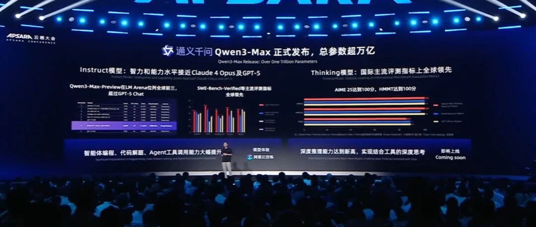 一场阿里的云栖大会,我真的感觉,他们把家底全都掏出来了。。。我虽然这次有事很可惜没去成现场,但是还是破天荒的8点多起床一下蹲了直播。过程中,我都看懵了,就一股脑子发啊,各种各样的模型,挨个掏。我大概数了下, 纯今天新发布的新模型有两个,一个是整个Qwen系列最强的Qwen3-Max,另一个是爆火的Wan2.2的后续模型Wan2.5,这玩意支持跟Veo3一样的音画同出的特性,是有点东西的。然后也正式发布了前几天为了预热提前发布的模型,比如目前Qwen里面最强的Qwen3-VL模型,还有一个全模态模型Qwen3-Omni,还有全新的模型架构带来的Qwen3-Next等等。我最快速度整理+体验了一波,给大家直接一文总结一下,来自阿里的全发布。最牛逼最新的,肯定就当属Qwen3-Max正式版了,直接对标GPT-5、Claude Opus 4这些世界顶尖模型。上一次发Max还是今年1月29日除夕发布的,半年后,他们终于把Qwen3-Max掏出来了。在LMArena上,之前的Qwen3-Max-Instruct的预览版,在这个全球最权威的匿名模型对战平台上,并列前三,直接把GPT-5-Chat都甩在了身后。这次的Max,是真的把参数堆满了。