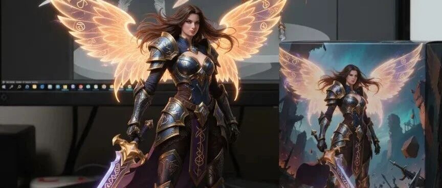 以用户提供的角色形象生成一个写实手办模型,如果用户提供的是半身形象就使用半身形象进行创作,不要对角色形象进行拓展和补充,手办底座是一个圆形的透明亚克力,底座上不要有任何文字。手办的后面是一个手办包装盒,包装盒上印着用户提供的角色原画。手办和包装盒放置于电脑桌面上,电脑显示器正在展示3ds max软件中对手办的建模过程。手办要占据画面的主体。