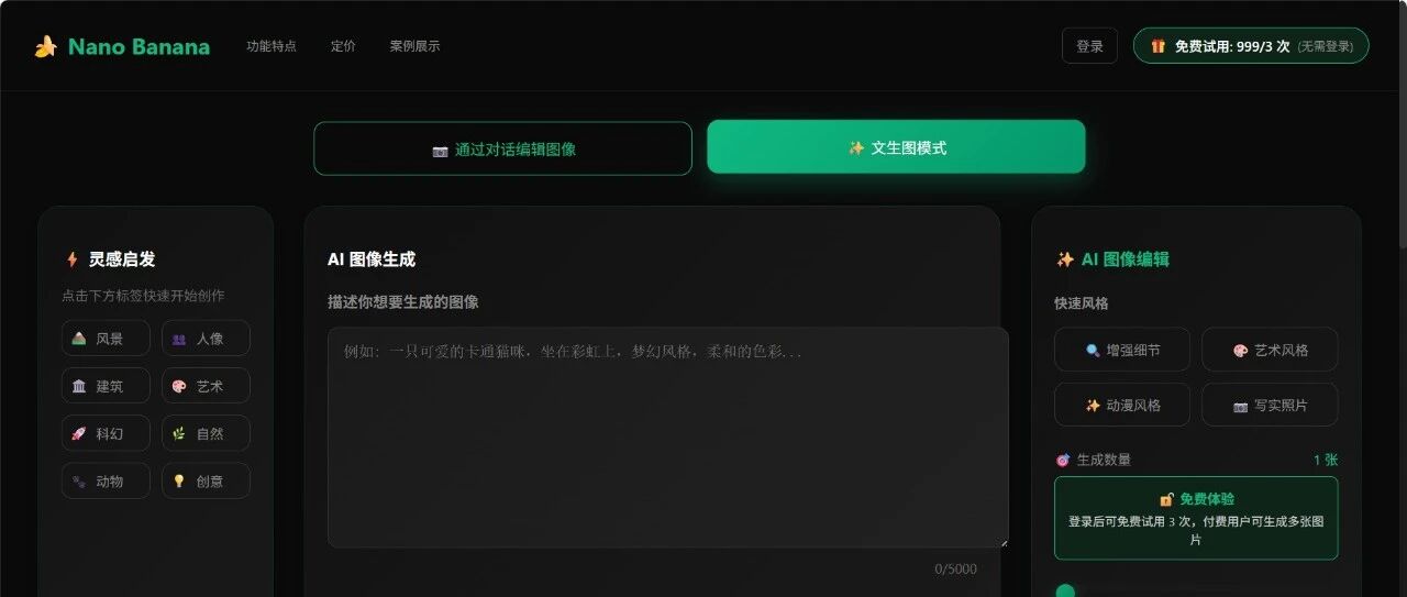 这是一个可以直接体验 NanoBanana 的免费网站,界面纯粹,专注于生成功能,但对网络环境有一定要求。