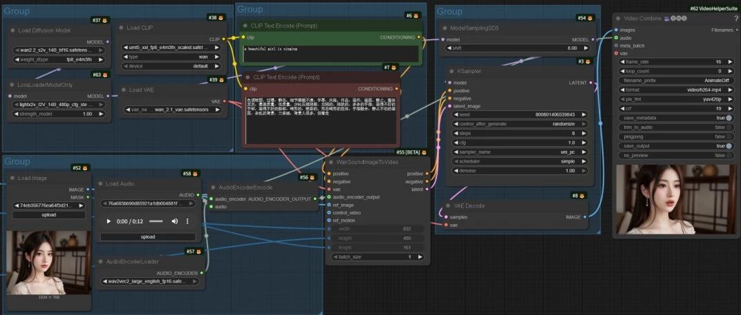 主模型是我们刚刚下载的s2v_14B模型,CLIP和VAE和和W2.2是通用的,另外就是这里加载了一个lightx2v_I2V的加速lora,让整个工作流速度更快。