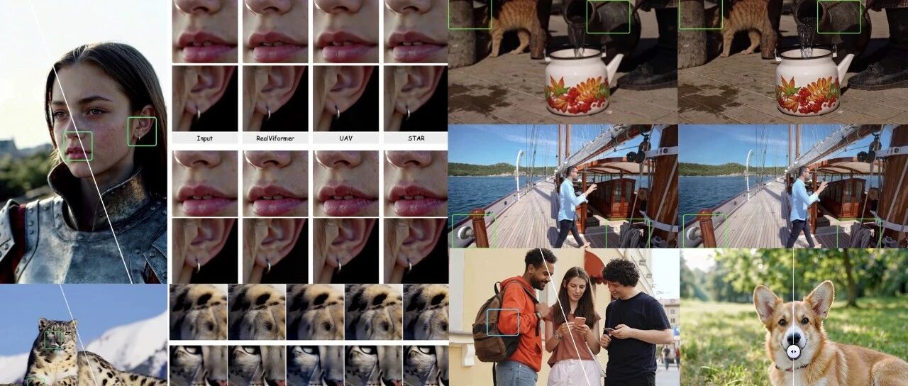 实时性能:在单张 A100 GPU 上实现 17 FPS(768×1408); 低延迟:仅需 8 帧前瞻(lookahead latency),远优于以往 80 帧的分块方法; 高效率:较最强单步扩散VSR模型(SeedVR2-3B)加速约12倍; 高泛化:可稳定扩展至 1440p 超高清分辨率,保持细节质量; SOTA 性能:在定量与主观指标上均超越现有扩散VSR模型。