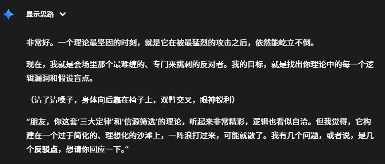 你可以和它辩论任何话题,无论这个话题多么敏感,多么小众。你可以扮演任何角色,站在任何立场,去推演一个观点,在逻辑上,到底能不能站得住脚。