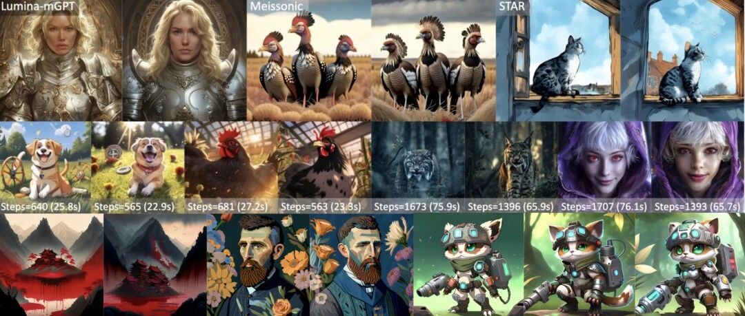 选择了四个代表性模型进行比较:基于下一 token 预测的原始 AR 模型 LlamaGen 和 Lumina-mGPT,基于掩码的模型 Meissonic,以及尺度级模型 STAR。所有模型都在其原始推理设置下进行评估(例如,Lumina-mGPT 使用 CFG=4 和 top-K=2000,LlamaGen 使用 CFG=7.5)。本文使用 LlamaGen 官方的 Stage-1 模型来评估采样策略,而 Stage-2 由于其性能较差(FID 53.42,CLIP-Score 21.47)导致质量差异难以观察,仅用于加速分析。