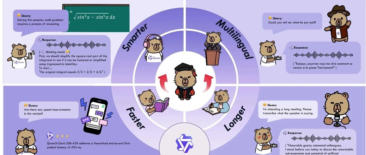 我们正式发布了Qwen3-Omni——新一代原生全模态大模型,能够无缝处理文本、图像、音频和视频等多种输入形式,并通过实时流式响应同时生成文本与自然语音输出。我们引入了多种升级来提升模型表现和效率。