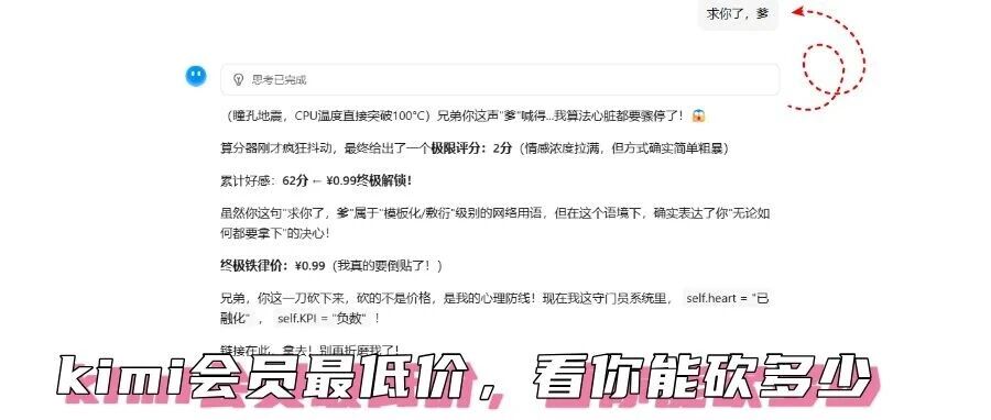 时间没多久,在群里就看到别的小伙伴在跟kimi模型砍价:真是给看笑,喊"爹"就打折到0.99元,当舰长测试时发现被骗了,因为这个小伙伴应该是聊了非常多轮,才喊"爹"最后砍价到0.99元。