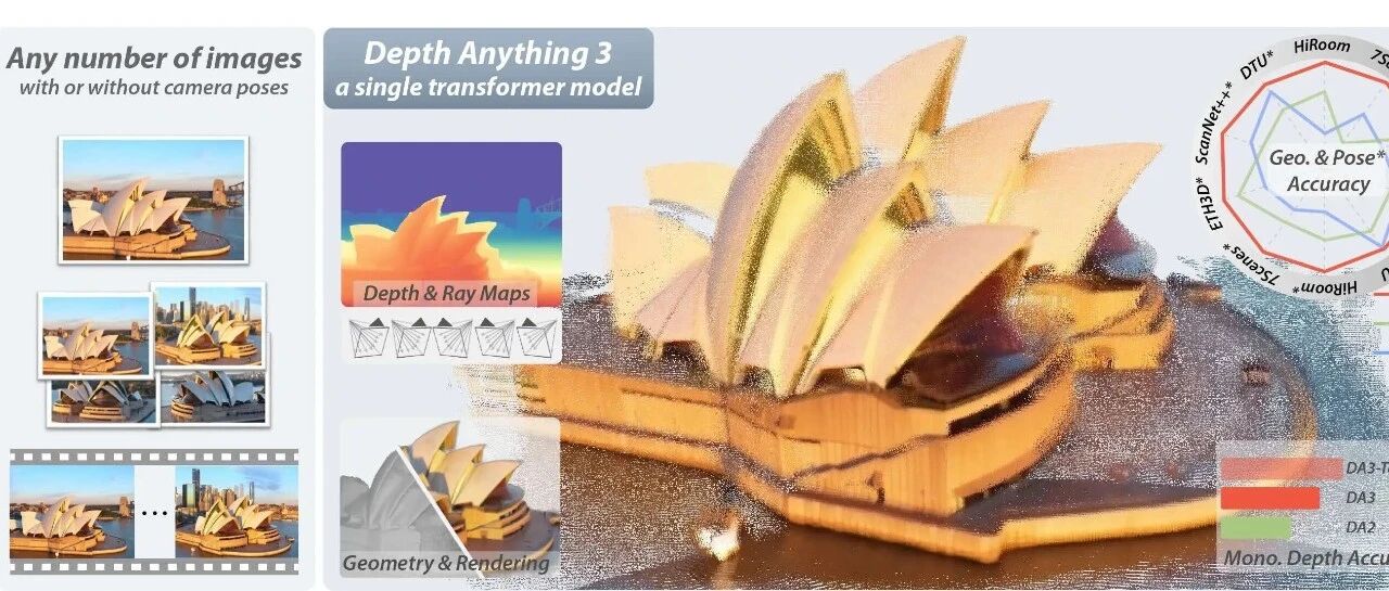 字节提出 Depth Anything 3,能够从任何视觉输入中恢复空间,并实现卓越的几何精度和 3DGS 渲染。