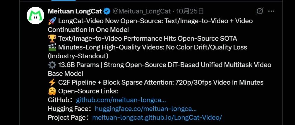 刚过一周,最新的 SOTA 开源视频模型 LongCat-Video 就端上来了。这么快的操作属实是按月发模型了。