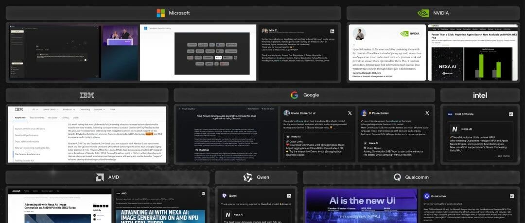 与 Qualcomm、Apple、AMD、Intel、NVIDIA 等芯片厂商深度合作,针对特定硬件优化运行效率。例如,Hyperlink 借助 Qualcomm Hexagon NPU 的 80 TOPS 算力,实现隐私与性能的兼顾;在 AMD Ryzen AI 平台上,模型解码速度达 51.78 tok/s。